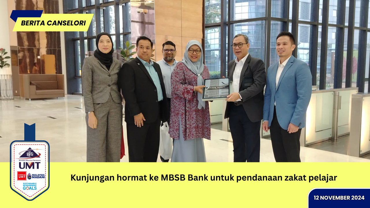Naib Canselor UMT, Prof. Ts. Dr. Mohd Zamri Ibrahim bersama Pengarah Pusat Islam Sultan Mahmud UMT, Prof. Madya Dr. Riswadi Azmi telah mengadakan kunjungan hormat ke MBSB Bank Berhad di Kuala Lumpur untuk meneroka hubungan strategik baharu dan mencari peluang pendanaan untuk Tabung Zakat UMT bagi membantu pelajar asnaf UMT yang memerlukan.