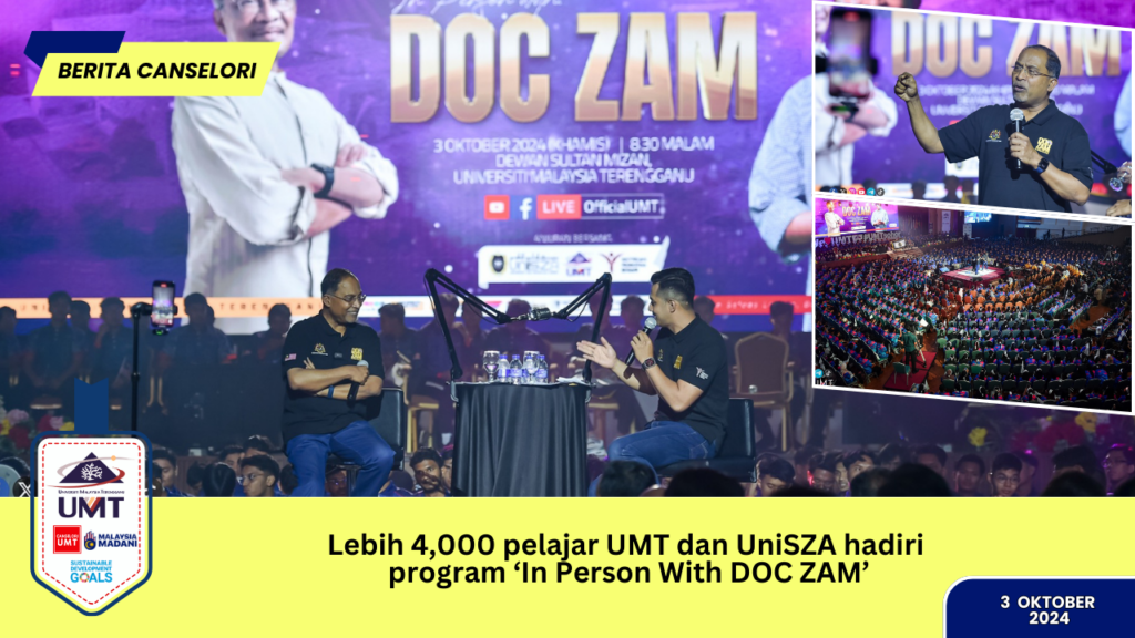 Seramai lebih 4,000 orang pelajar UMT dan UniSZA hadir memeriahkan program ‘In Person With Doc Zam’ yang diadakan di Dewan Sultan Mizan UMT pada 3 Oktober 2024. Dalam program tersebut, Menteri Pendidikan Tinggi (KPT), Datuk Seri Dr. Zambry Abdul Kadir berkata, pelajar seharusnya menggunakan masa dan ruang yang ada di kampus Universiti untuk belajar membina hubungan dengan ilmu dan masyarakat terutamanya pelajar-pelajar yang ‘introvert’ kerana kehidupan di kampus sangat berharga.