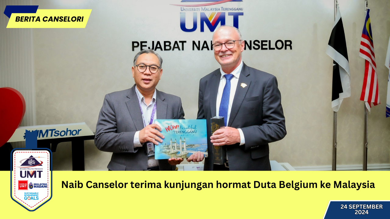 Pada 24 September 2024, Naib Canselor UMT, Prof. Ts. Dr. Mohd Zamri Ibrahim telah menerima kunjungan hormat Duta Besar Belgium ke Malaysia, Tuan Yang Terutama Peter Van Acker di Pejabat Naib Canselor UMT. Dalam sesi pertemuan tersebut beberapa perkara telah dibincangkan termasuklah hubungan kerjasama penyelidikan UMT dalam ASEAN Fisheries Education Network (ASEAN-FEN) dan program-program penyelidikan dengan Ghent University di Belgium. Selain itu, kedua-dua pihak turut membincangkan mengenai peluang untuk mewujudkan lebih banyak program kerjasama saintifik antara UMT dengan negara Belgium bagi menghadapi cabaran yang dihadapi oleh komuniti dunia terutamanya dalam aspek keterjaminan makanan, perikanan, akuakultur dan ekosistem marin.