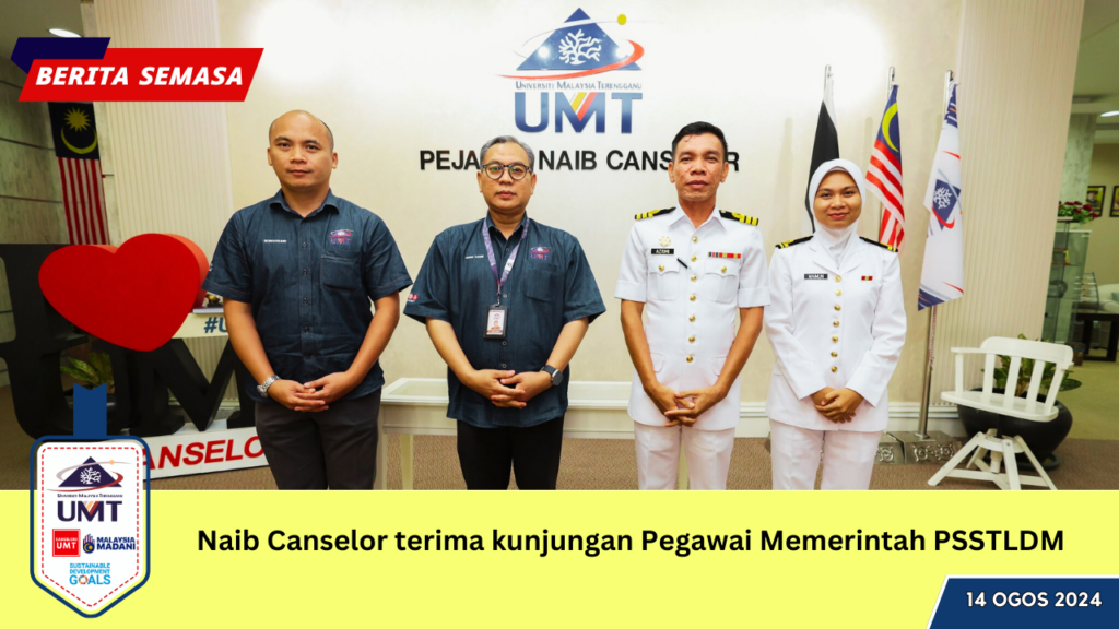 Naib Canselor UMT, Prof. Ts. Dr. Mohd Zamri Ibrahim menerima kunjungan hormat Pegawai Memerintah Pasukan Simpanan Tentera Laut (PSTL) Setiu, Kdr Khairul Azrimi Ariffin PSSTLDM pada petang tadi. Turut hadir Pengarah Pusat Kokurikulum dan Citra Pelajar UMT, Encik Borhanudin bin Mohd Yusof @ Mohamed, dan Pegawai Staf PALAPES LAUT UMT, Lt Dya Siti Maimun binti Ismail PSSTLDM.