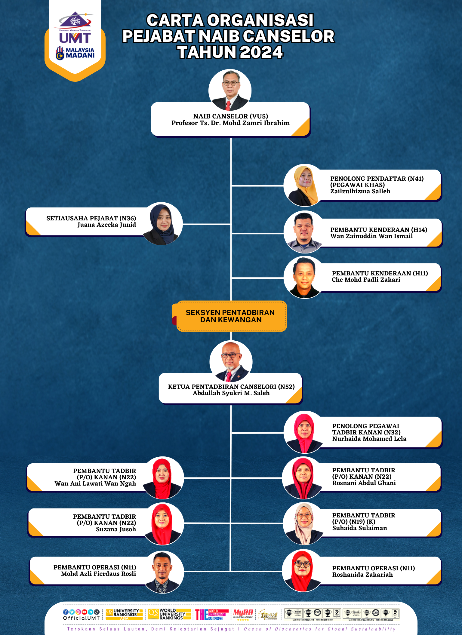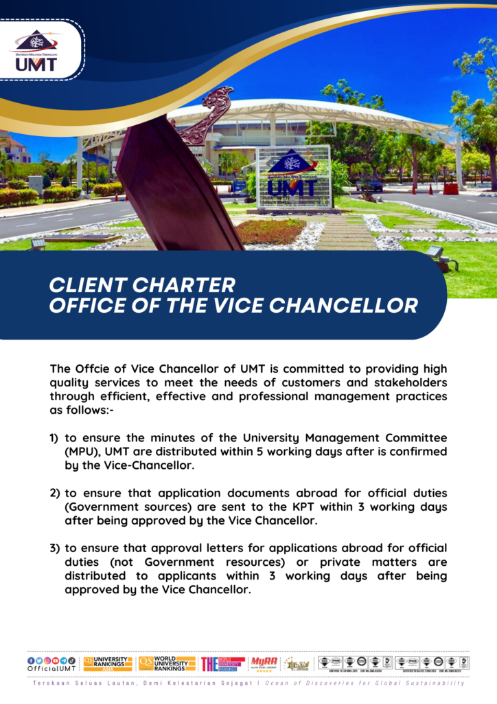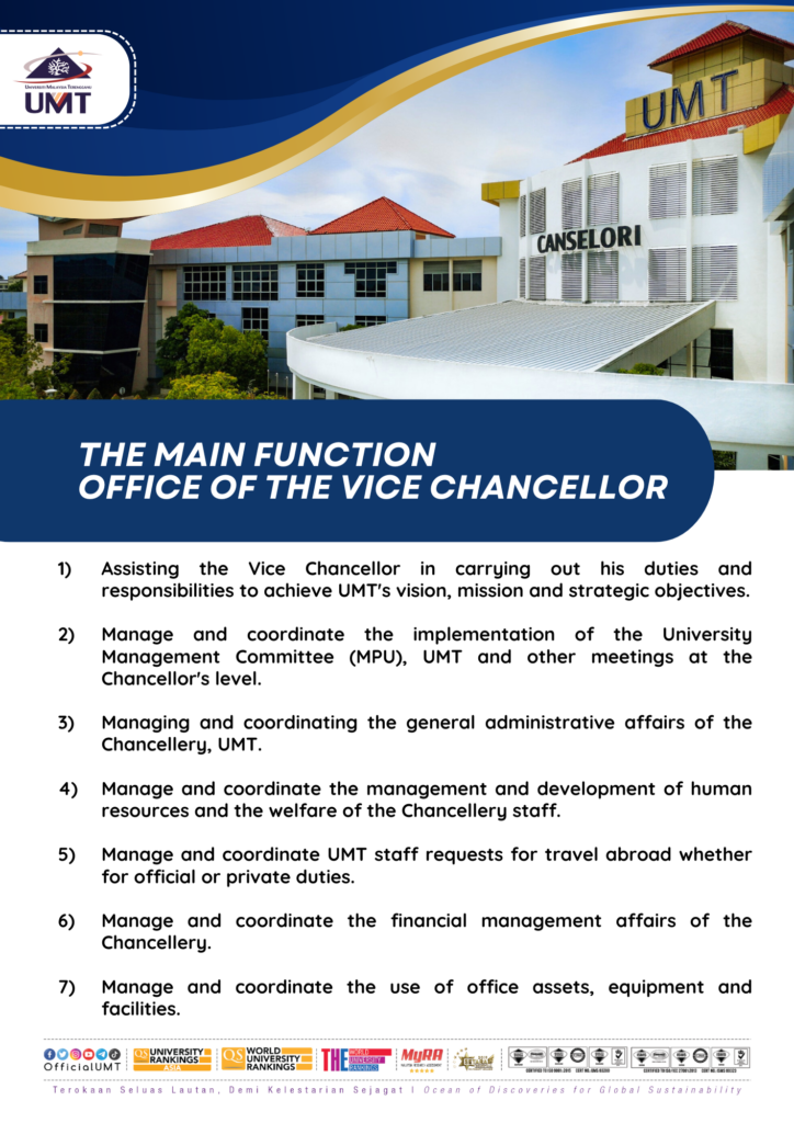 The Office of the Vice-Chancellor is the office of the Chief Executive Officer and Head of Services in UMT, namely the Vice-Chancellor. It functions to assist the Vice-Chancellor in carrying out all matters related to university governance to ensure that all program planning and policies are implemented successfully in line with UMT’s vision, mission and strategic objectives. In February 2013, the Vice-Chancellor created the position of Head of Chancellery Administration to manage and handle the administrative and financial operations of the Vice-Chancellor’s Office as well as monitor the Chancellery’s administrative and financial affairs as a whole.