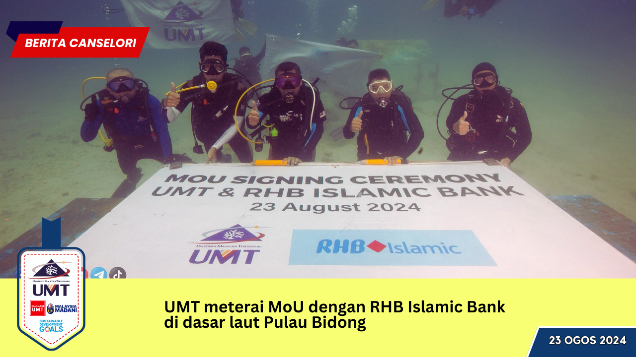Bagi menyokong usaha untuk memulihara warisan budaya dan alam semulajadi dunia terutamanya kehidupan marin, UMT telah memeterai Memorandum Persefahaman (MoU) dengan RHB Islamic Bank dan uniknya majlis MoU tersebut telah diadakan pada 23 Ogos 2024 bertempat di dasar laut Pulau Bidong Terengganu.